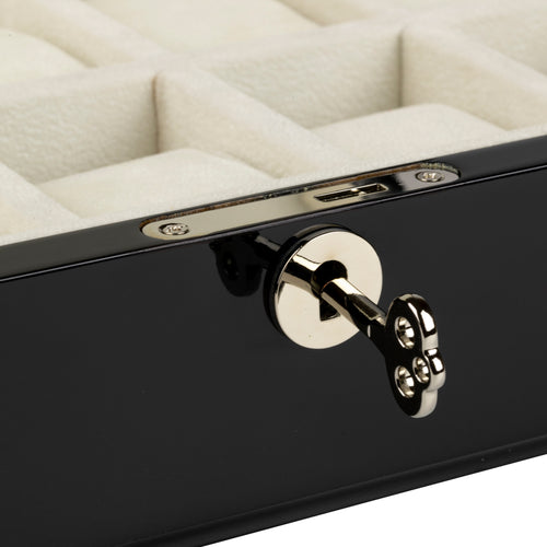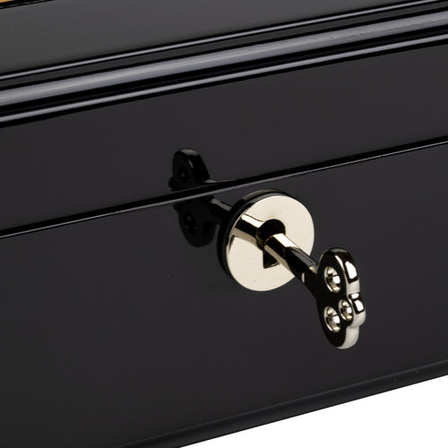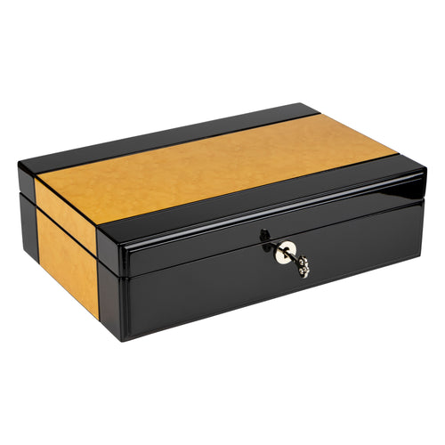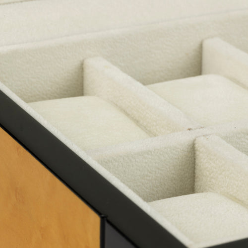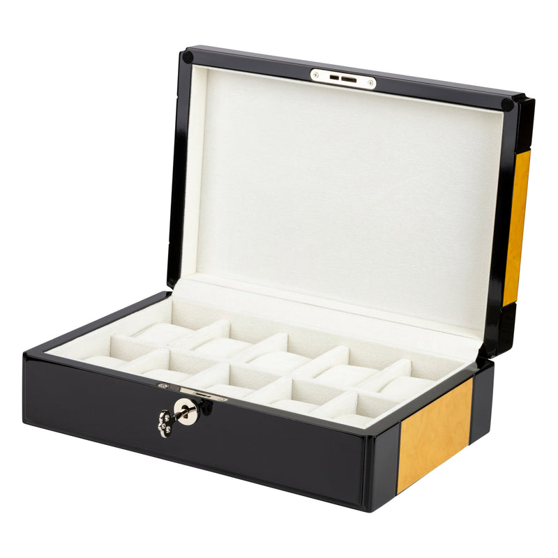Wooden watch box with striking golden oak and black design veneer, holds 10 watches with soft white velvet interior. Stylish silver accents and lock.