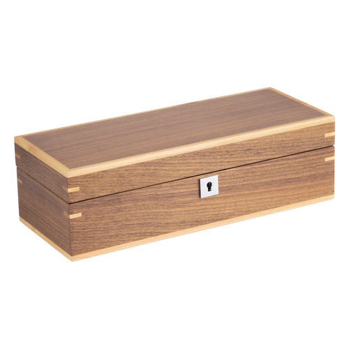 Handmade walnut veneer finish 5 watch lock box with soft caramel velvet interior and large pillows. Elastic storage sleeve for extra straps or jewellery storage. Stylish silver accent hinges and lock.