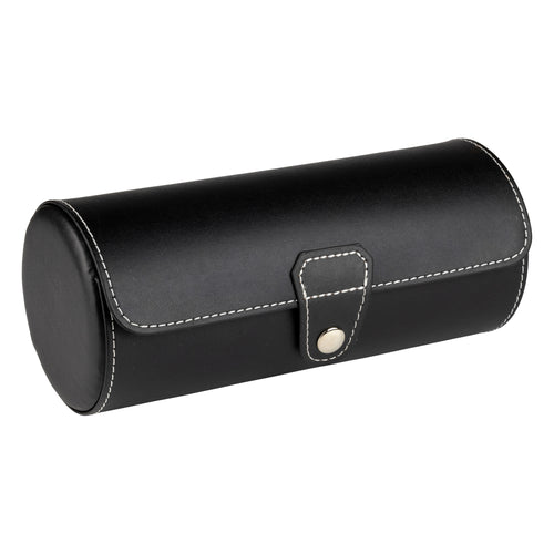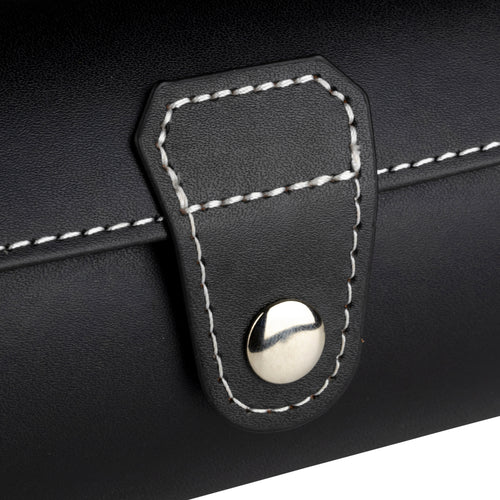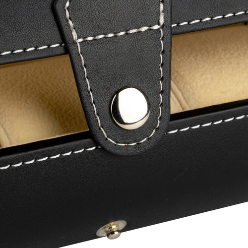 Black watch roll with distinctive white stitch accents. Soft cream velvet lining that holds 3 watches with individual soft cream velvet pillows. Firm holding push button securely holds watches in place.