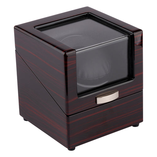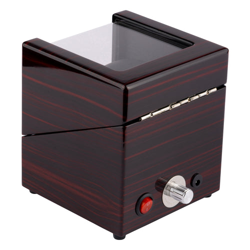 Ebony polish wooden watch winder with glass display top. Whisper quiet Japanese Mabuchi Motor with 5 stage speed controls from stop, 750, 1000, 1500, 1800, turns per day. Includes DC power wall adapter.